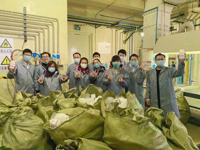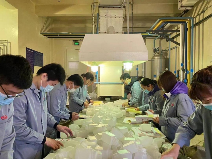在听取化工厂党总支书记王金华、副厂长王云祥、安全总监李川介绍产品、贴签安全相关事项后。总部团员青年们穿好工作服来到车间,经过2小时的劳动,共贴签6000个,为企业生产贡献一份绵薄之力。
