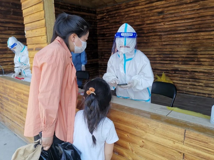 每天下午,我就作为“大白”根据社区安排到不同小区支援,主要做身份信息采集工作,与医护人员配合分发采集管,并及时提醒医护人员封管,减少时间浪费,加快检测速度,这样,居民在烈日下排队的时间就可以缩短了。